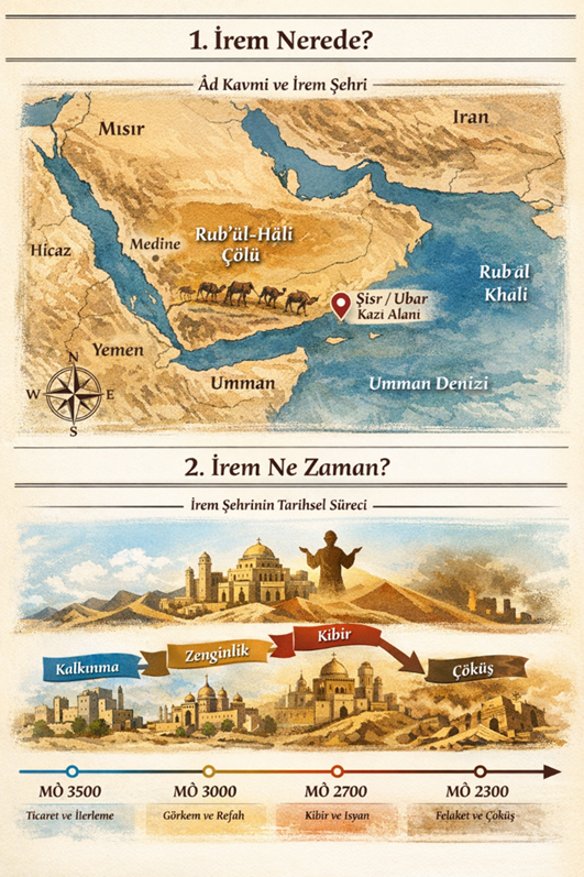 Biraz ansiklopedik ve birazda akademik olarak verdiğim bu bilgilerin dışında Kur’an-ı Kerim İrem Şehrinden ve o şehrin özelliklerinden de bahsediyor. Ayrıca şehrin ve halkın sosyal ve kültürel yapısından bahsettiği gibi dini yapısından ve inançlarından da söz ediyor. Aslında baktığınız zaman bu bilgilerin tamamı teferruat. Ama Kur’an eyer bunlardan bahsediyorsa teferruat özelliğinden çıkar. Demek ki Kur’an bize bu detaylar üzerinden bir şey anlatmak istiyor. Kısaca Cenab-ı Hak bize burada diyor ki: