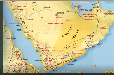 Bu bilgiler ışığında Ad kavminin yaşadığı coğrafyaya harita üzerinden bakacak olursak AHKAF denilen bölge Haritanın alt tarafında SANA ile başlıyor ve UMMAN’a kadar uzanıyor ve gene haritadan da gördüğümüz gibi İREM şehrini içine alıyor. Haritanın ortasına doğru baktığımız zaman RUH’ÜL-HALİ isimli bir yer göreceksiniz. Burası bu coğrafyanın meşhur bir çölüdür. HALİ boş anlamına geliyor. Burası dünyanın en büyük çöllerinden bir tanesidir. O zamanlarda ve hatta bu gün bile insanlar oraya girmeye korkarlar. Çünkü burada çöl bataklıkları vardır ve çok tehlikelidir.