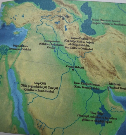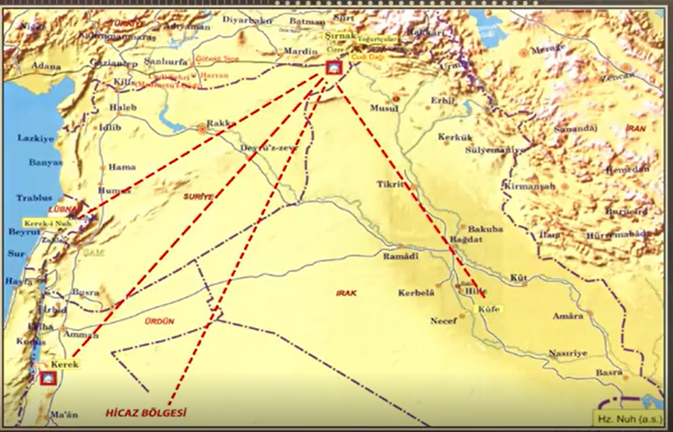 Kaynaklarımızda Hz. Nuh a.s.’ın yaşadığı yer ile alakalı dört tane rivayet var. Bakın yukarıdaki resimde hicaz bölgesini görüyorsunuz. Amman’ın biraz daha altında Kerek denilen bir yer var, orada da yaşadığına dair bir rivayet var. Lübnan’a yakın Kerek-i Nuh diye bilinen bir yer var oraya dair. Bir de Kufe’ye dair. Ama neresi olursa olsun Cudi’ye doğru gidişat bu şekilde. Yani o kırmızı işaretleri takip ettiğimiz zaman yolculuğun nereden nereye olduğuna dair de bir şeyi burada görmüş oluyoruz.